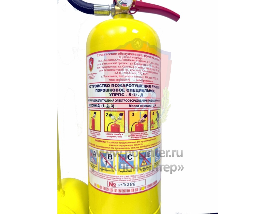Огнетушитель порошковый специальный УПРПС–5(3)-Д предназначен для тушения пожаров класса D — возгораний активных металлов и металлосодержащих веществ на производственных объектах.